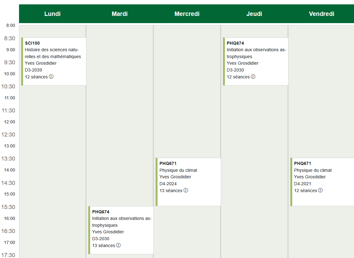 Mon horaire pour la session d'automne 2025 est ci-dessous (cliquez dessus pour une version agrandie). Lorsqu'absent de mon bureau, je peux répondre à vos questions pendant les pauses des cours. Je consulte aussi très régulièrement mon courriel (yves.grosdidier@usherbrooke.ca): beaucoup de questions peuvent être résolues par ce moyen.